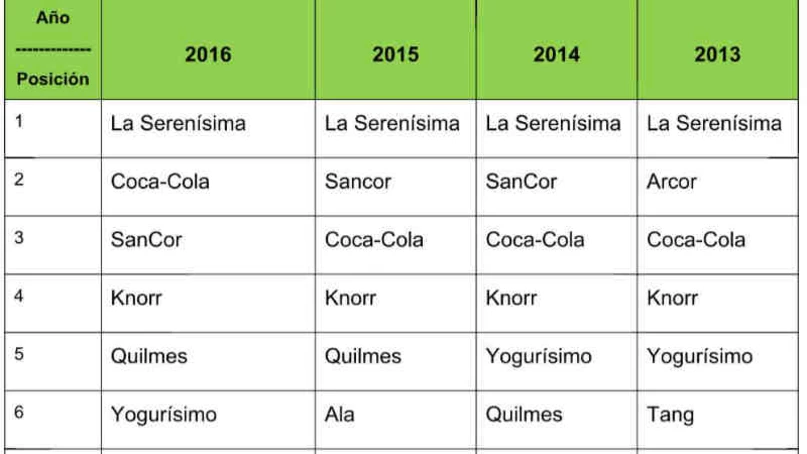 Nueve de las 10 marcas que integran el top ten en Argentina corresponden al sector de alimentos y bebidas: La Serenísima, Coca-Cola, SanCor, Knorr, Quilmes, Yogurísimo del fabricante Danone, Arcor, Natura y Tang. A excepción de la marca de cuidado del hogar, Ala que ocupa la séptima posición.