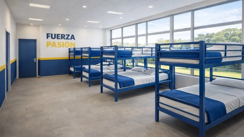 Según el diseño técnico del emprendimiento que se expone en materiales que ya están circulando y a los que accedió este medio, el hotel Alfa Omega contará con camas cuchetas reforzadas, colchones de dos metros de largo —un diferencial poco habitual en alojamientos de este tipo—, climatización frío-calor, cerraduras electrónicas y una fuerte apuesta a la luminosidad natural. “Además, el esquema se apoya en la sinergia directa con el predio deportivo del club, que ofrece gimnasio, pileta y canchas, lo que permite un modelo de alojamiento orientado al rendimiento, la convivencia y la logística de equipos y contingentes”, contó el impulsor.