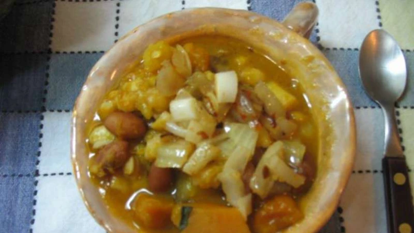 Enjuagar y dejar en remojo los porotos y el maíz, todo por separado, durante 12 horas. Al otro día, cocinar las alubias por 30 minutos a fuego mínimo, los porotos negros por 25 minutos y el maíz por 40 minutos. Rallar la calabaza, picar todas las verduras y al verdeo cortarlo al bies. En una cacerola grande, dorar la cebolla, la parte blanca del verdeo y la zanahoria con un chorrito de aceite y una pizca de pimienta y sal. Luego agregar la calabaza rallada, el maíz blanco, las alubias, la paprika o pimentón y 300 cc de agua. Cocinar durante 10 minutos. Después, agregar los porotos negros y la parte verde del verdeo. Cuando todo esté tierno, apagar el fuego, incorporar las semillas y servir.